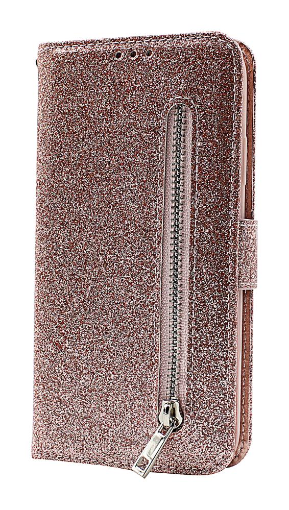 Korttitaskujen takana on lisäksi lokero, jossa voi säilyttää seteleitä tai kuitteja. Puhelinlompakon kuori on TPU-materiaalia, toisin sanoen se on pehmeä kehys kännykällesi. Glitter Wallet -puhelinlompakossa on standcase-ominaisuus, joten voit laittaa puhelimen kaltevaan asentoon, kun haluat katsella elokuvia puhelimestasi. Kotelon takana on vetoketju. Tämä on enimmäkseen koristeena, sillä tasku on hyvin pieni eikä siihen mahdu paljon kolikoita, mutta se on hieno yksityiskohta lompakossa. Standcase Glitter Wallet -puhelinlompakossa on hieno, sileä pinta ja upea kimalleväri. Kotelon sisäpuoli on yksivärinen. Kotelossa on magneettisuljenta. Luonnollisesti kotelon takana on aukko kameralle, joten sinun ei tarvitse irrottaa puhelinta, kun otat kuvia.